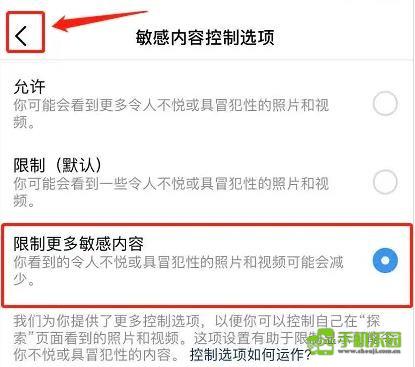 7.成功后点击【返回】,设置【限制更多敏感内容】成功