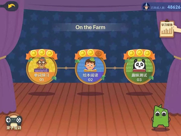 学习互动,孩子可以通过互动版块,和家长英语对战游戏;