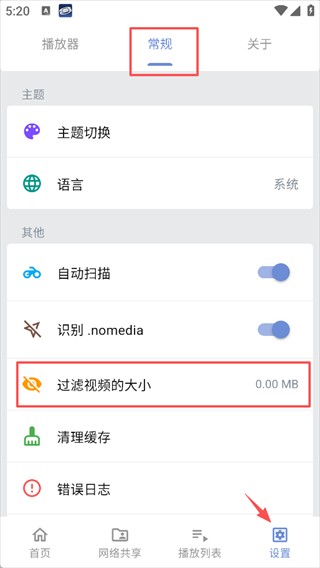 2、如果我们手机里的视频资源比较多,而你又只想追剧,那可以在设置-常规-其他栏里过滤掉并自定义视频的大小,比如大部分片子都在100M以上,我们设置100M,软件就会过滤掉100M以下的视频资源,非常的方便。