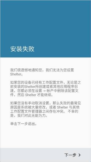 1、如果用户的手机已经有工作配置文件,都必须在手机设置帐户中删除工作配置文件,然后Shelter才能正常工作,不然的话会提示失败