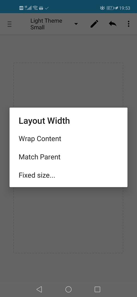 6、然后我们把两个小线性布局的宽度调成屏幕的宽度。点击小正方形虚线框,找到Layout Width = Wrap Content这一项,点击之后弹出如下的窗口: