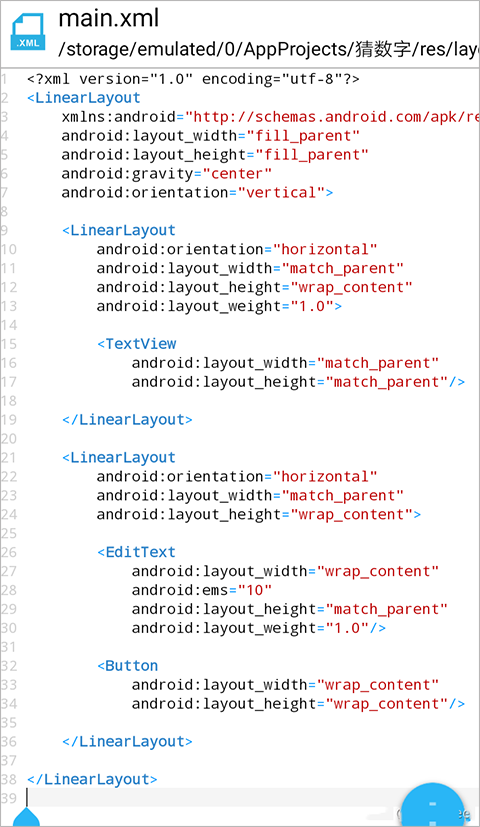 里面涉及到的控件有三个:文本框,编辑框和按钮。这些控件都需要放在一个“容器”里面,以便于控制其位置。这里我们使用的“容器”是比较简单的线性布局(LinearLayout)。线性布局里面的控件都会按照左右顺序或者上下顺序依次排成一条直线。而在我们的这个界面里面,却是编辑框和按钮水平排列在屏幕底部,然后两者作为一个整体和上面的文本框上下排列在一起。