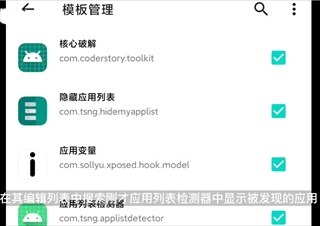 7、返回模板管理,勾选 applist detector 检测到的app,勾选之后,点击左上角箭头返回,点击参数规则,填入我提供的拦截规则,点击右上角保存