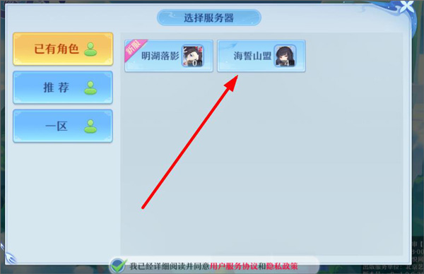 2、打开选区后,可查看已有的一区和推荐新服区,点击已有角色;