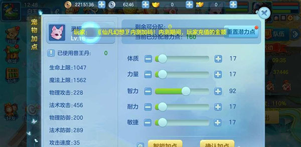 灵宠加点推荐先观察灵宠的资质技能再选择加点 法系类灵宠加点智力 物理系灵宠加点力量等