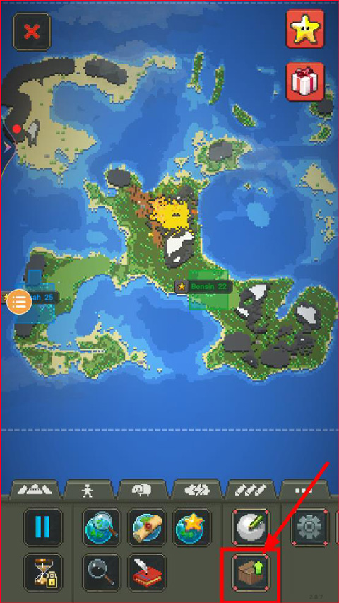 1、打开上帝之手游戏,登录进入游戏主页面,玩家可以创造和塑造世界、创建文明帝国/村庄、添加生物、查看世界法则等,点击下方工具栏中的盒子标志;