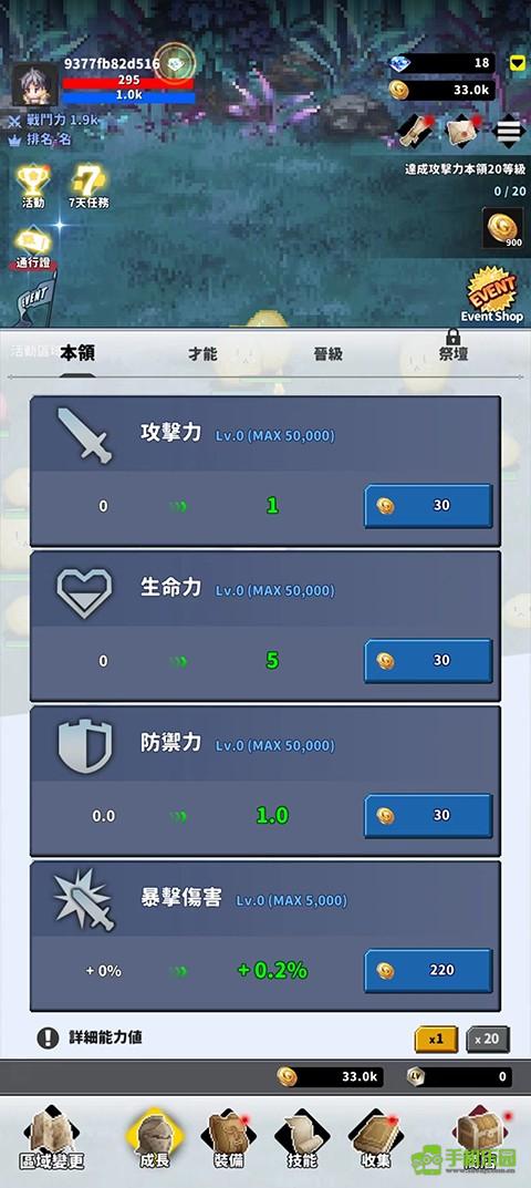2、点击下方的成长选项,使用金币提升你的攻击力、生命值、防御力和暴击伤害等,让你在战斗中更具优势;