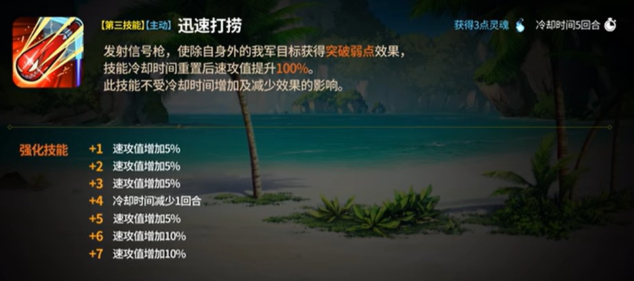 亚澜的主动技“别动”能够扬起沙尘攻击敌方目标,拥有基础35%的眩晕概率,消耗灵魂燃烧后概率可提升至100%,同时根据自身最大生命值为全队回复等比生命。强化技能后,不仅冷却缩短,还能增加速攻值,为队伍提供进一步的节奏优势。她的终极技能“迅速打捞”则更强调团队作战,释放后可让除自身外的队友获得“突破弱点”效果,并在技能冷却重置后直接提升速攻值,为持续输出或循环控场提供条件。