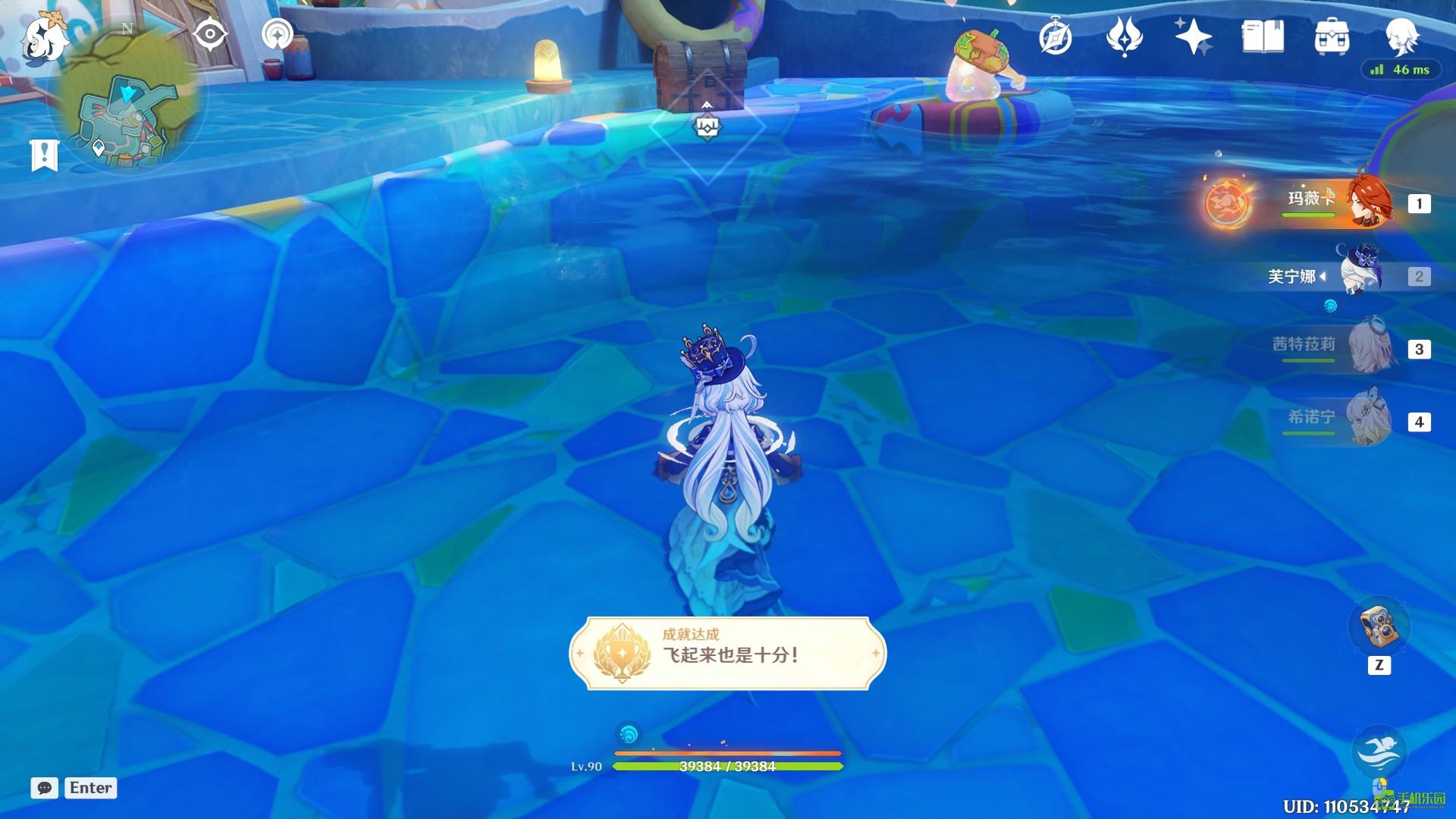 来到「呼呼丘」传送点二楼,就是剧情旅行者住的房间门口,能看见一个泳池和跳台。